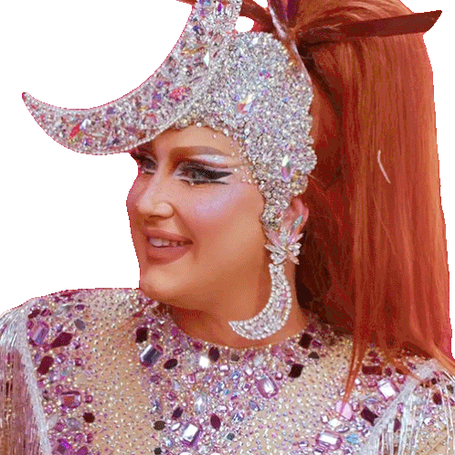 Nehellenia from RuPaul's Drag Race Global All Stars claps enthusiastically, adorned in a dazzling, jeweled outfit and headpiece.