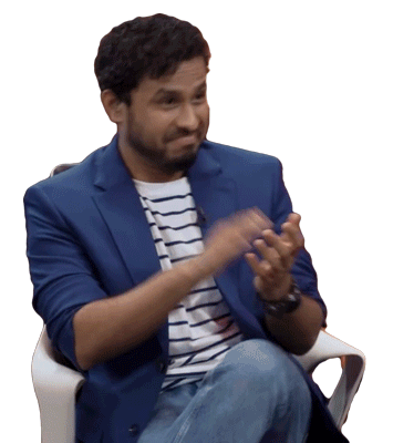 Comedian Abish Mathew claps enthusiastically, seated in a chair, conveying appreciation, approval, or congratulations.