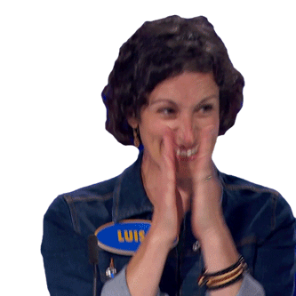 Luisa from Family Feud Canada claps her hands enthusiastically, celebrating a good job or a win with a wide smile.