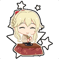 Clarice from Idolmaster enjoys a cozy snack at a kotatsu, smiling happily with stars around her.