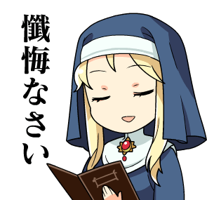 Clarice Idolmaster, the blonde nun, gently smiles, then opens her eyes to read 'Repent!' from a book.