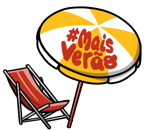 An animated sticker featuring a red beach chair and a yellow and white striped umbrella with '#Mais Verão' text, promoting summer.