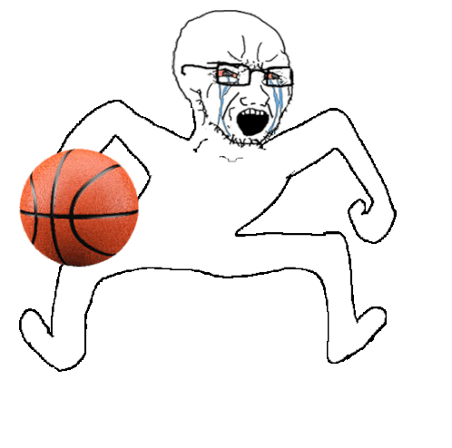 A crying Soyjak meme character, drawn in an outline style, is shown dribbling a realistic basketball.