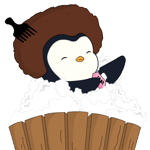 A cute cartoon penguin with a fluffy afro and a hair pick enjoys a relaxing bubble bath in a wooden tub, smiling contentedly.
