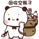 Bubu the panda diligently collects empty bottles for recycling, carrying a large sack, promoting environmental care.