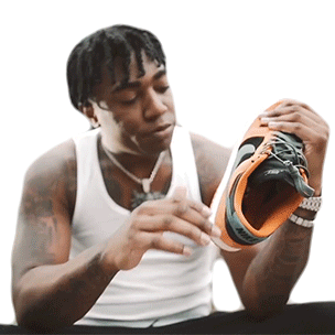 Fredo Bang carefully inspects and cleans the sole of his orange and black sneaker, wiping off dirt with his hand.