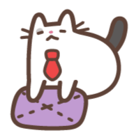 A white cat wearing a red tie, looking tired and bored, stands on a purple cushion and cleans its eye with a paw.