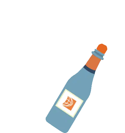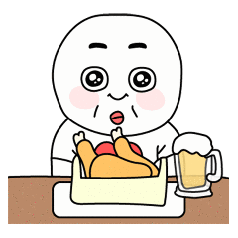 A happy cartoon character sits at a table, eagerly looking at a box of fried chicken and a frothy mug of beer, ready to enjoy a meal.