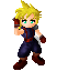 Cloud Strife, in chibi pixel art form, performs a powerful Limit Break with his Buster Sword and a fiery slash.
