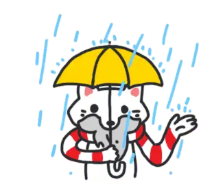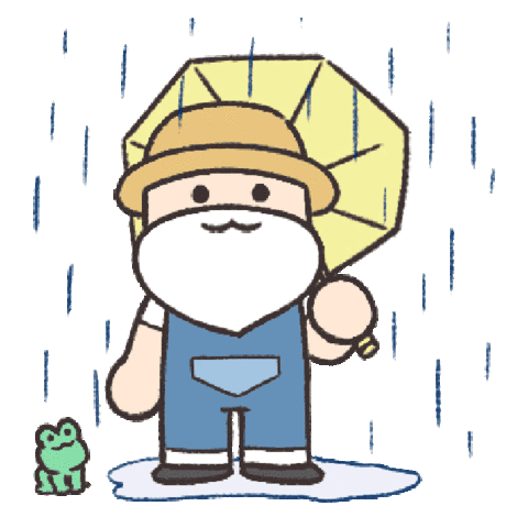 A cheerful cartoon man with a beard and hat holds a yellow umbrella in the rain, accompanied by a small green frog.