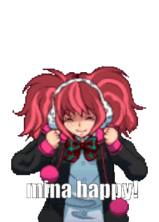 Clover Field Clover999 character, Mina, jumps happily with arms raised, displaying 'mina happy!' caption.
