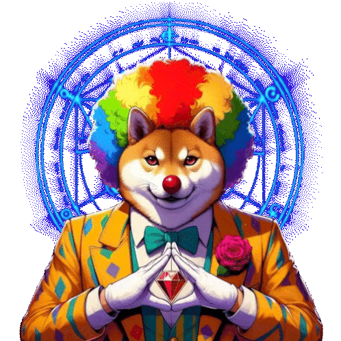An animated sticker of Clown Dog Idoge, a Shiba Inu in a clown suit with a rainbow wig, holding a red gem.