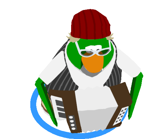 Club Penguin character Petey K, a green penguin in a red hat and sunglasses, playing a white accordion.