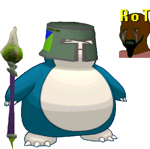 Animated OSRS meme featuring a Snorlax-like character wearing a helmet, with various clan tags like ROT, Zenith, Apex, and DR appearing.