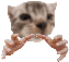 a pixelated image of a cat 's face with a pair of hands holding it .