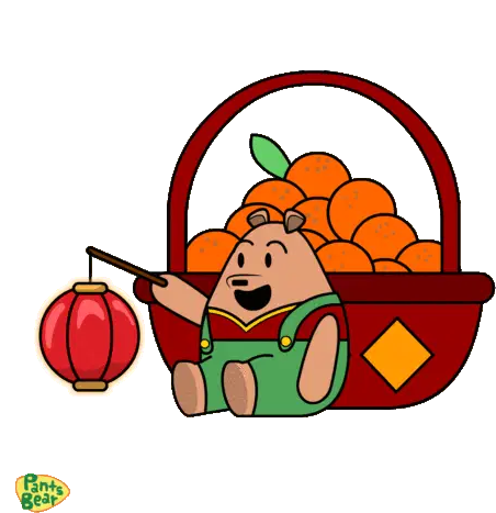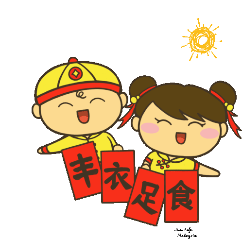Cheerful cartoon boy and girl in traditional Chinese attire holding scrolls with "Abundant food and clothing" for Chinese New Year.