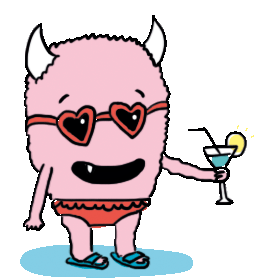A cute pink monster with horns and heart-shaped sunglasses enjoys a cocktail, ready for a summer pool day.