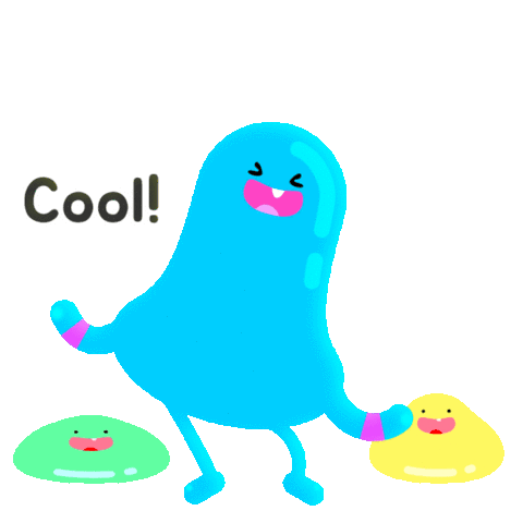 A large blue cartoon character with smaller green and yellow characters, exclaiming 'Cool!' with a confident pose.
