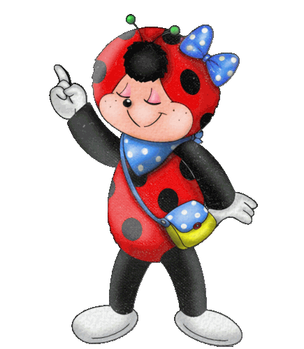 a ladybug wearing a blue and white polka dot bow and carrying a yellow purse