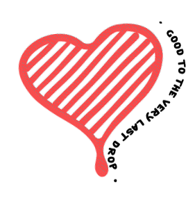 A red heart-shaped coffee cup with stripes and a dripping bottom, featuring the slogan 'Good to the very last drop'.