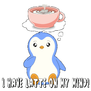 A cute penguin dreams of a delicious latte with whipped cream, expressing its coffee craving with 'I Have Latte On My Mind!'