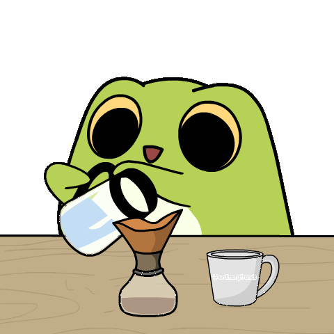 A cute green frog character with big eyes carefully pours water into a pour-over coffee maker, preparing a fresh brew.