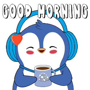 A cheerful Pudgy Penguin, wearing blue headphones, sips coffee and wishes 'GOOD MORNING' with a warm smile.