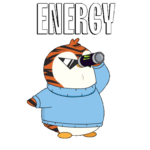 A tired Pudgy Penguin, striped like a tiger and wearing sunglasses, gets an energy boost from a can of energy drink, with 'ENERGY' text.