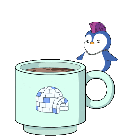 A punk penguin with a purple mohawk and chain necklace jumps into a light blue mug of coffee, making a splash.