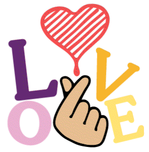 A vibrant 'LOVE' text animation featuring a finger heart gesture, a pink 'O', and a red dripping heart, perfect for expressing affection.