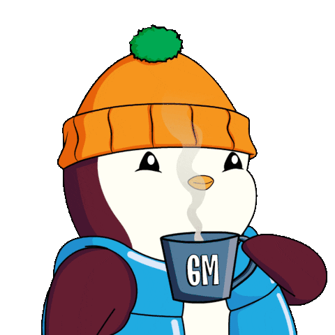 An adorable Pudgy Penguin sips from a 'GM' mug, enjoying a warm coffee or tea on a chilly morning.