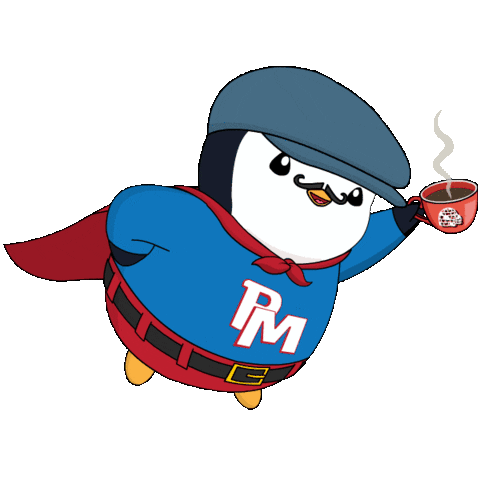 A charming superhero penguin, complete with cape and flat cap, flying while happily holding a steaming cup of coffee.