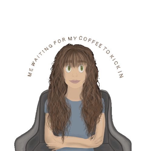 A woman with long brown hair and green eyes sits patiently, waiting for her coffee to take effect and energize her day.