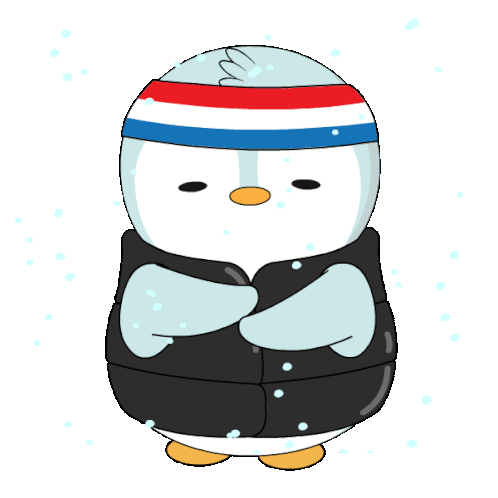 A cute cartoon penguin, wearing a red, white, and blue headband and a black vest, shivers in falling snow.