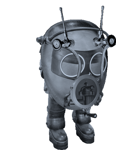 Colin Raff's unsettling black and white art sticker featuring a grotesque robot with a gas mask-like face.