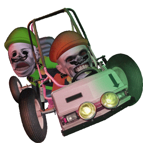 Colin Raff's unsettling animated sticker features two grotesque, zombie-like figures excitedly racing a kart, reminiscent of Mario Kart.