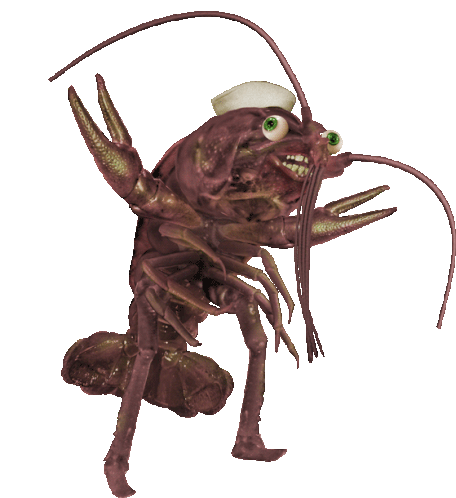 Colin Raff's grotesque sailor lobster creature, with green eyes and sharp teeth, strikes an excited, dancing pose.