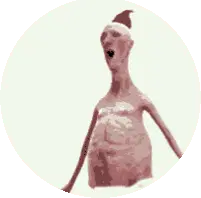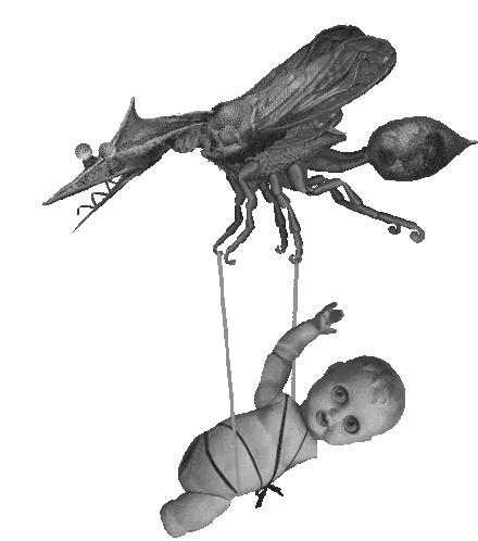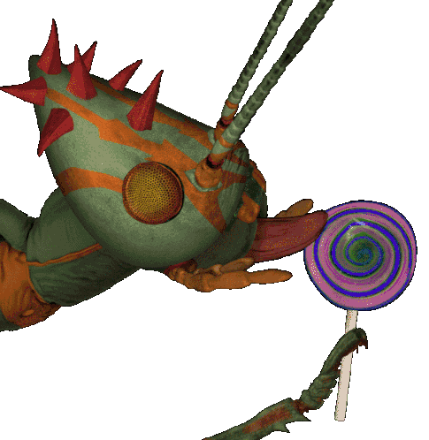 Colin Raff's grotesque insect creature with spikes and stripes extends its tongue to lick a colorful swirl lollipop.