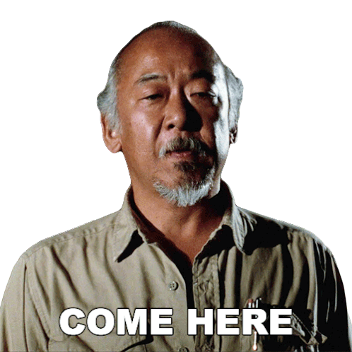 Mr. Miyagi from The Karate Kid, portrayed by Pat Morita, gestures and says "COME HERE".