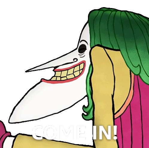 Joker character from Merry Little Batman animated series invites you to come in with a wide smile.