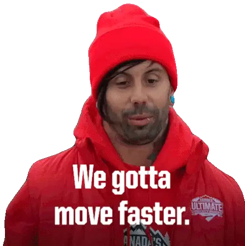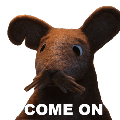 Dad Mouse from Robin Robin, a brown felt character with a mustache, looks pleadingly, urging 'COME ON'.