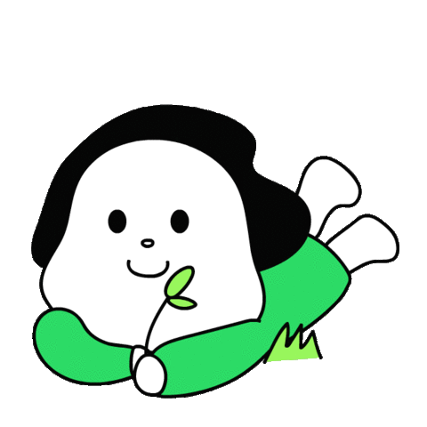 A cute cartoon character lies comfortably, smiling with open eyes, holding a plant, enjoying a relaxed moment.