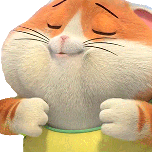 An animated orange and white cat from 44 Gatos happily chewing or swallowing a meatball with puffed cheeks.