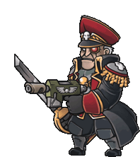 A stern Warhammer 40k Commissar from Shootas Blood And Teef, armed with a chainsword and gun, ready for battle.