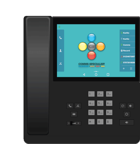 An animated sticker showcasing Commsspecialist's services, including phone solutions, data, broadband, IVR, and SMS, displayed on a modern desk phone.