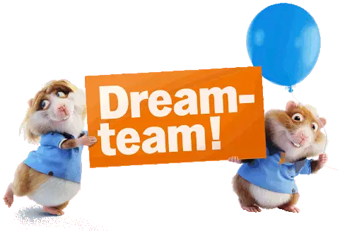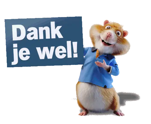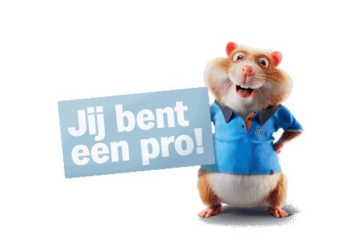 A cheerful Albert Heijn hamster holds a sign saying 'Jij bent een pro!' (You are a pro!), perfect for Compliment Day.