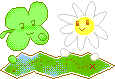 A charming pixel art sticker featuring a green clover character, a smiling daisy flower, and a map.