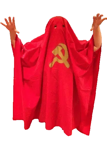 Animated sticker featuring a red ghost with a hammer and sickle, representing the 'ghost of communism' and Karl Marx's ideology.