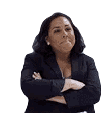 Evelyn Castro, a woman in a black suit, stands with arms crossed, making a funny, sassy face, nodding in agreement.
