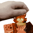 Tigger, a sad-looking cat wearing a party cone, receives gentle head pats from a human hand, a comforting gesture.